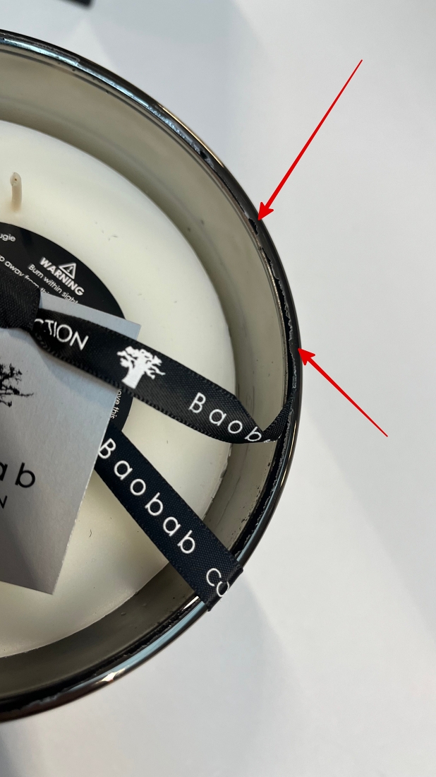 Tato vonná svíčka utrpěla na kráse, její horní okraje nejsou dokonalé, lehce sloupaná barva po obvodu je vadou na kráse. Její vůně i kvalita vosku naštěstí zůstala neměnná, a tak si můžete užít provonění bez omezení. 😊