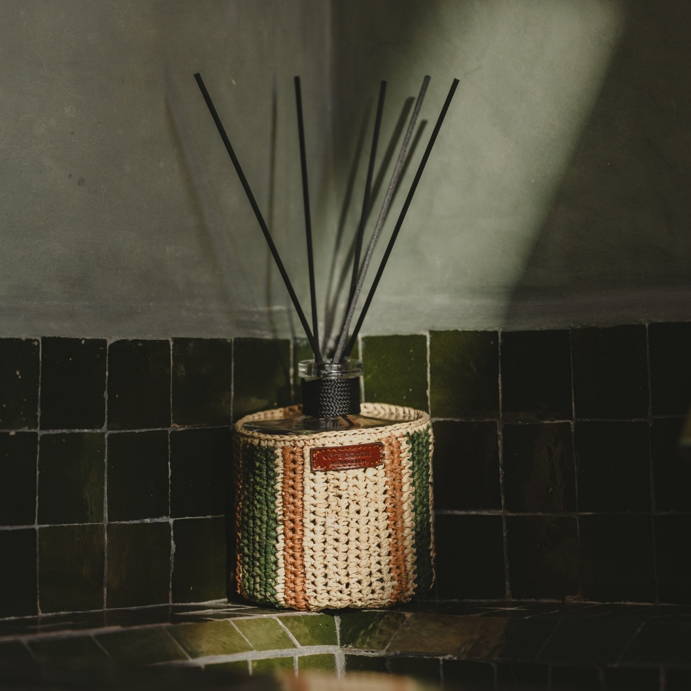 Difuzér je ručně oplétaný rafiemi – tenkými, pružnými vlákny získanými z listů palmy rafie, která se v Maroku tradičně používají k pletení košů, dekorací nebo textilií.