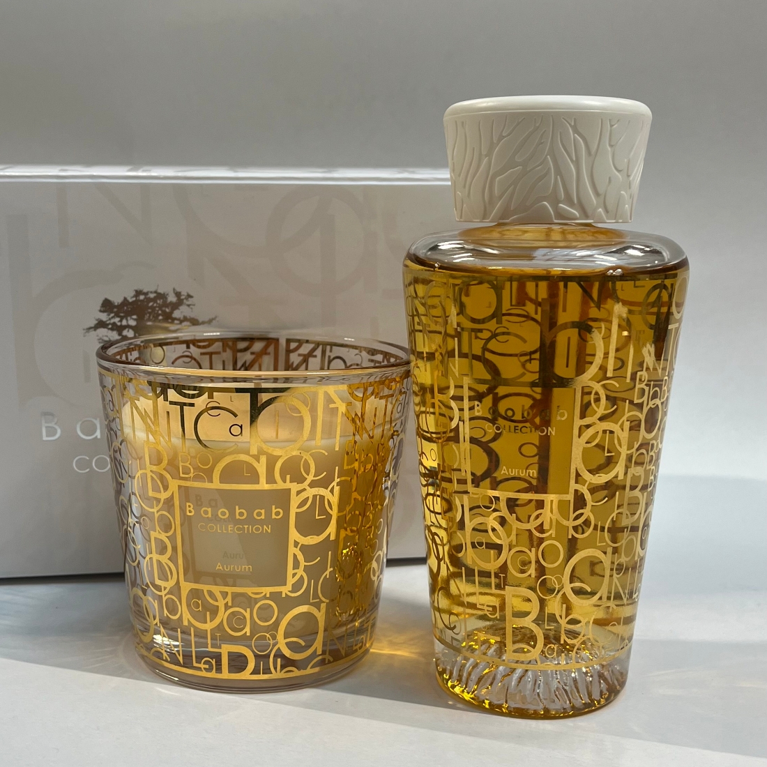 Vonná svíčka i difuzér jsou zdobené modro-zlatým monogramem značky Baobab Collection .