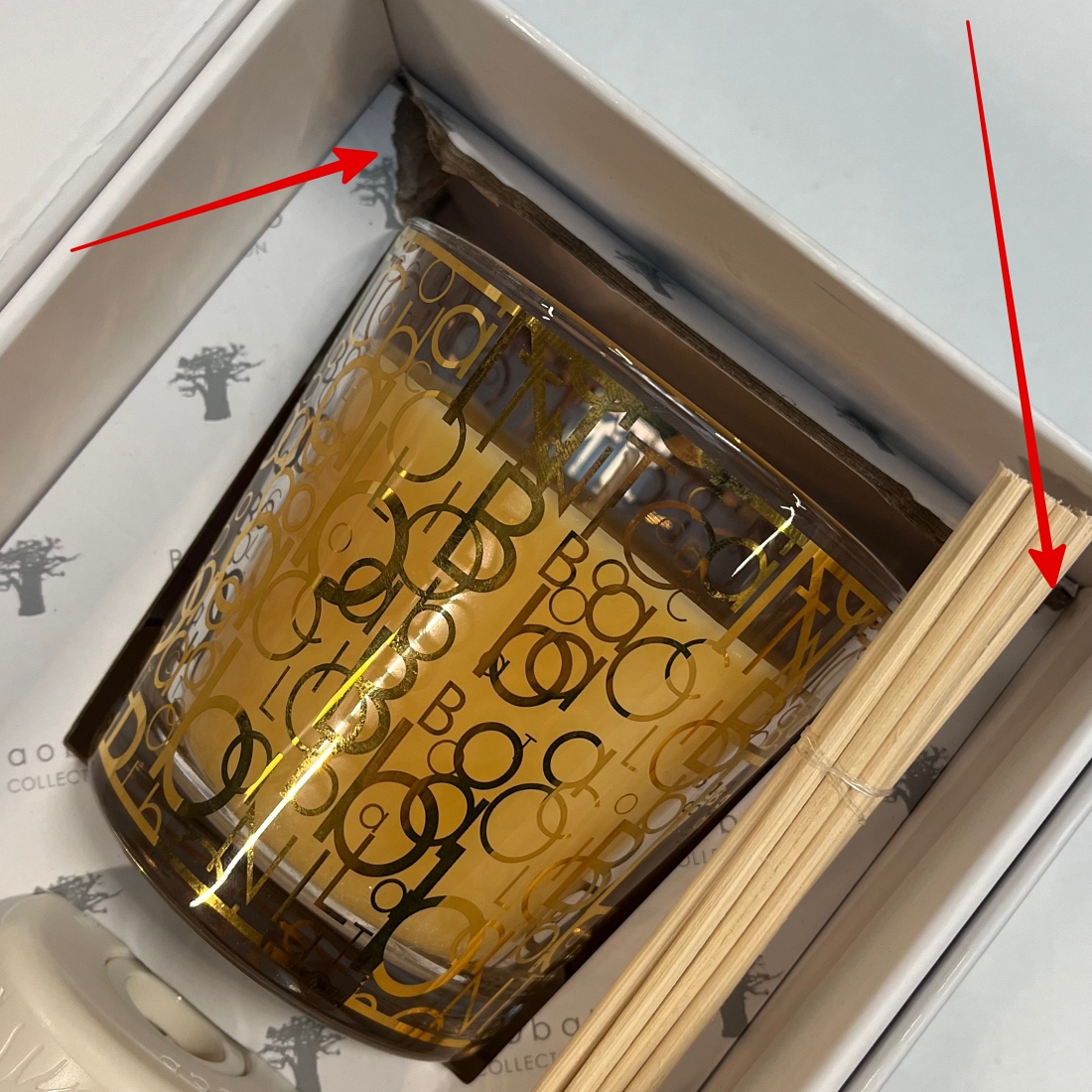 Dárková sada vonné svíčky a tyčinkového difuzéru - vonná svíčka má zažloutlý vosk a vnitřní část krabice je roztrhlá. Na funkčnost produktu nemá vliv.