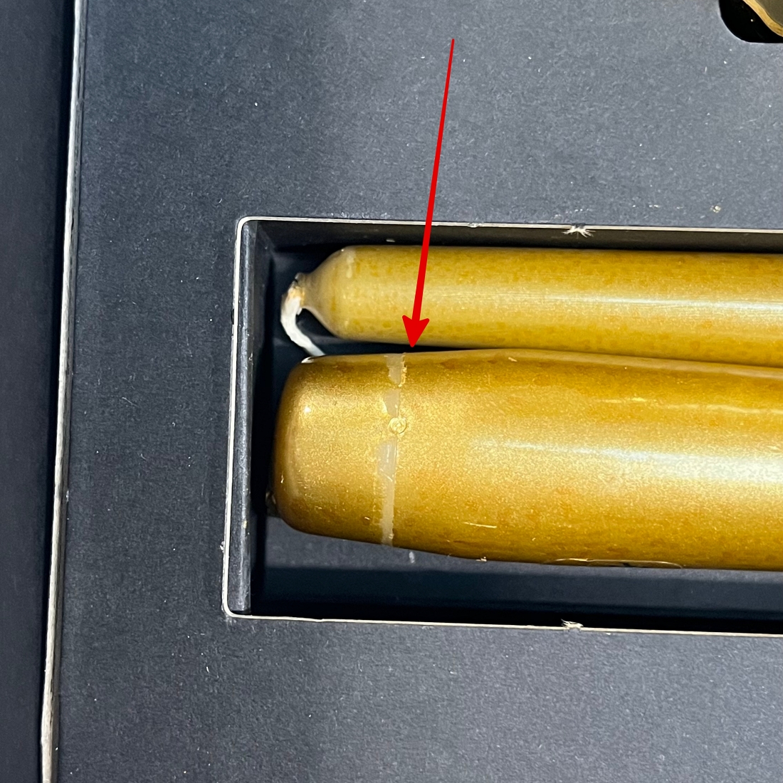 Krásný dárková set svícnů a vysokých svíček (bez vůně). Vadou tohoto setu je krabička, která nese vlásečnicové škrábance a poškrábaná barva na svíčkách. Důkladně nafoceno.