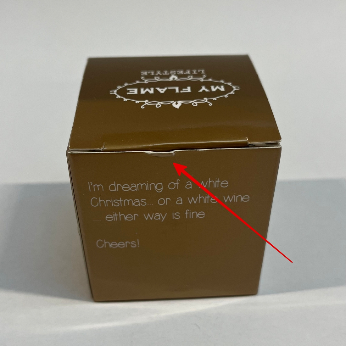 Roztomilá malá svíčka Let it Snow. Její krabička je poznamenaná přepravou, její rohy jsou pomačkané, samotná svíčka je v pořádku.