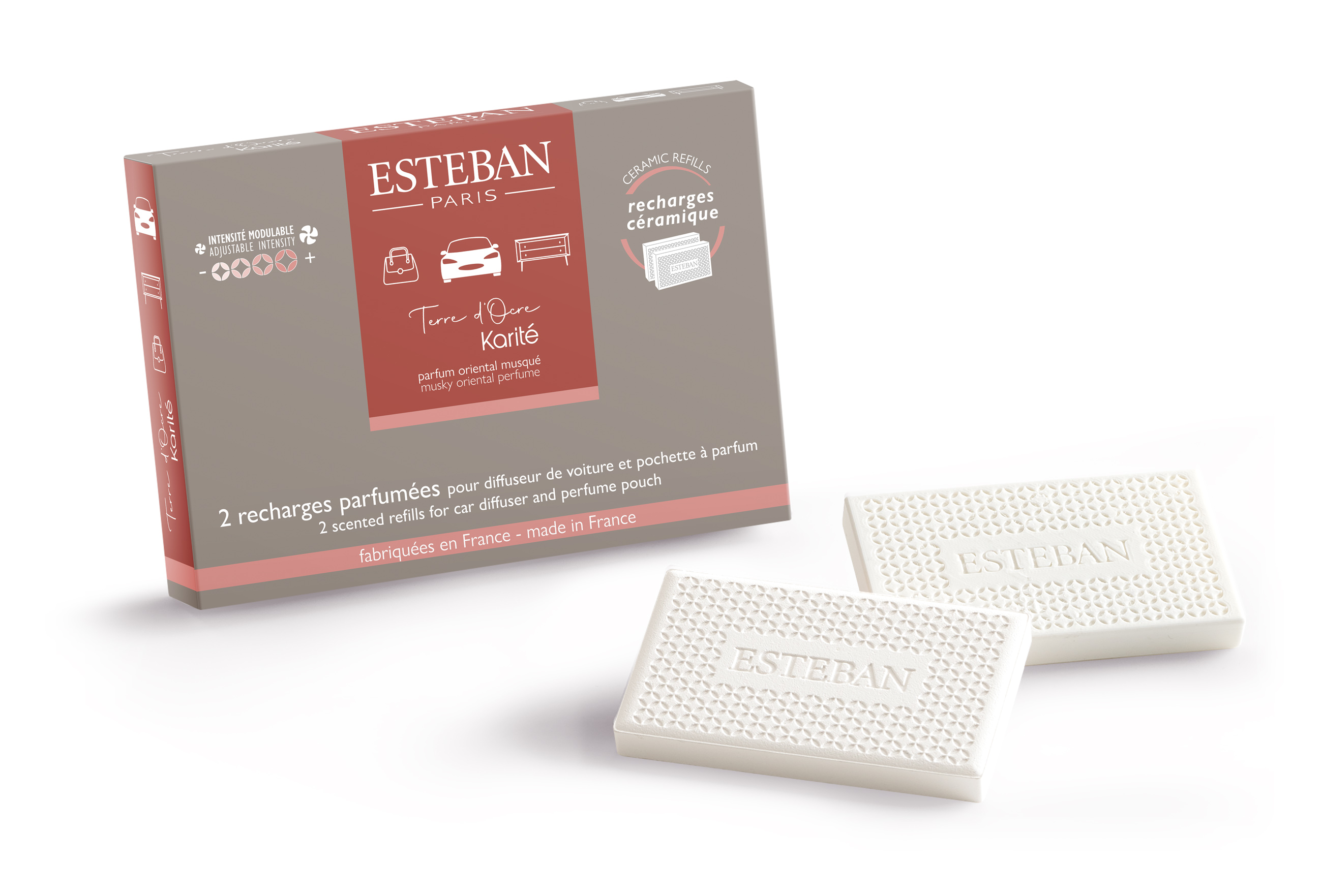 Náhradní náplní k vůni do auta od značky Esteban Paris Parfums jsou tyto keramické destičky, které slouží k znovu provonění interiéru vozidla. Po vyvonění iniciační náplně či její slabší vůni v auto difuzéru můžete destičku nahradit novou. Je čistě na vás, zda-li zvolíte vůni stejnou či jinou. Keramickou destičku stačí lehce vyjmout z auto difuzéru a nahradit ji novou keramickou destičkou, která vám zaručí opět velmi příjemný provoněný interiér auta.