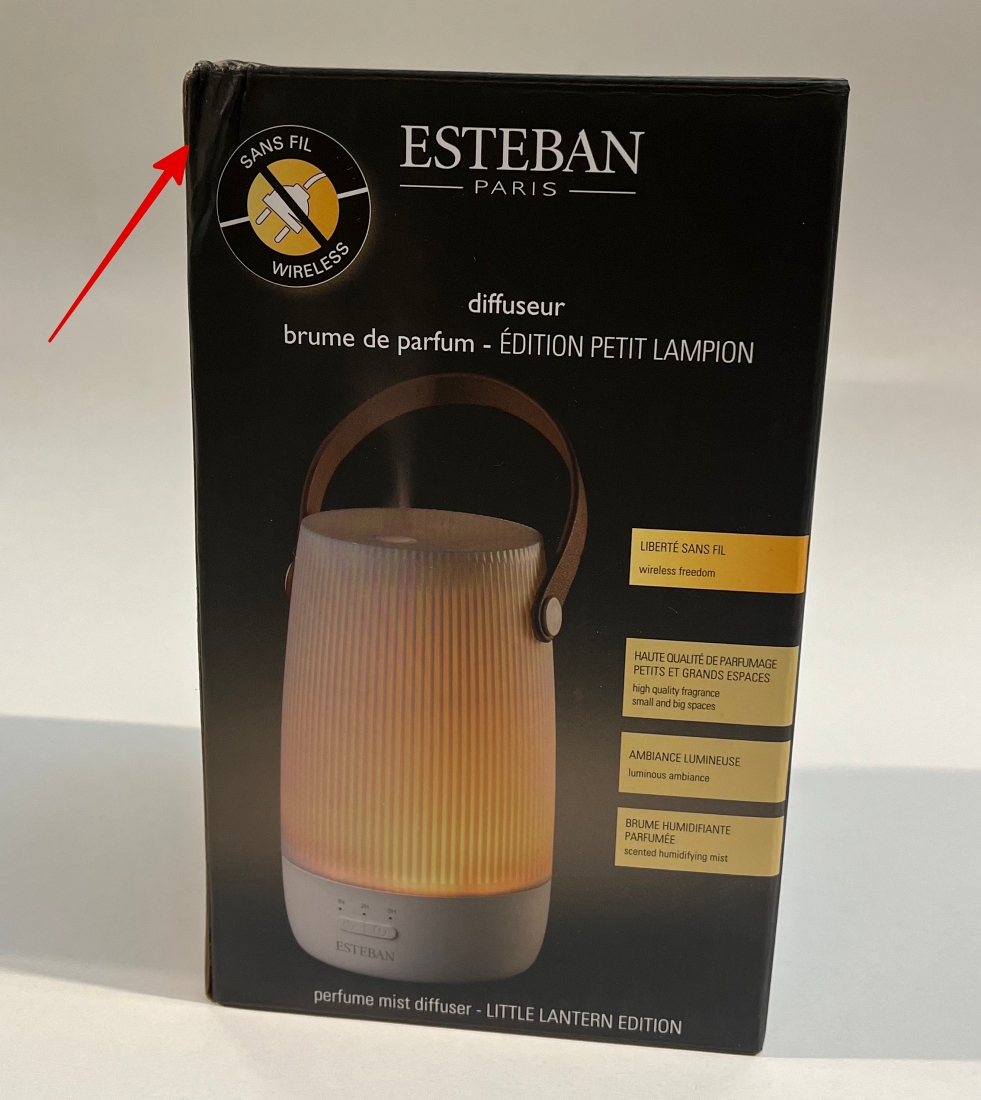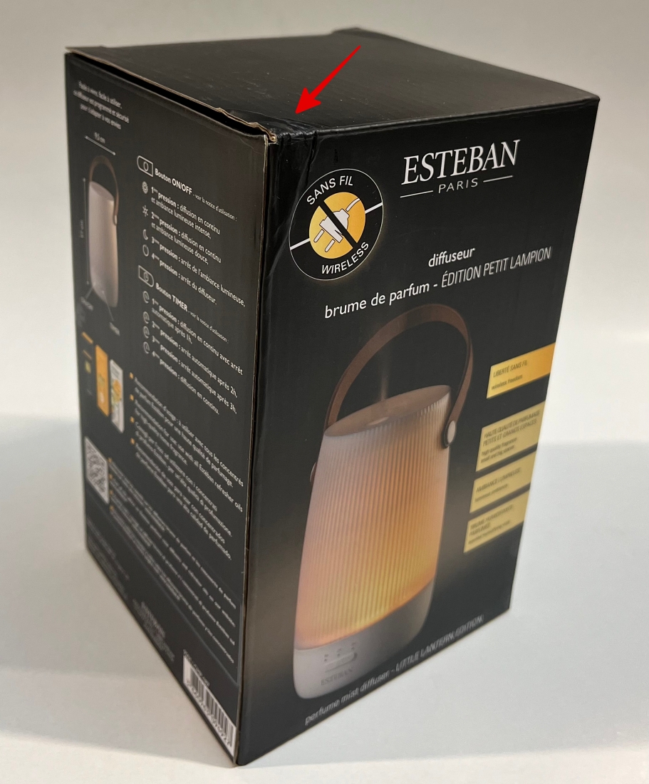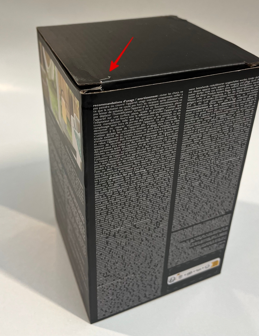 Krabice tohoto difuzéru utrpěla drobné poškození, je poznamenaná přepravou – zmáčklá krabička. Samotný difuzér uvnitř je ale zcela v pořádku, bez poškození a připravený provonět váš interiér. 😊