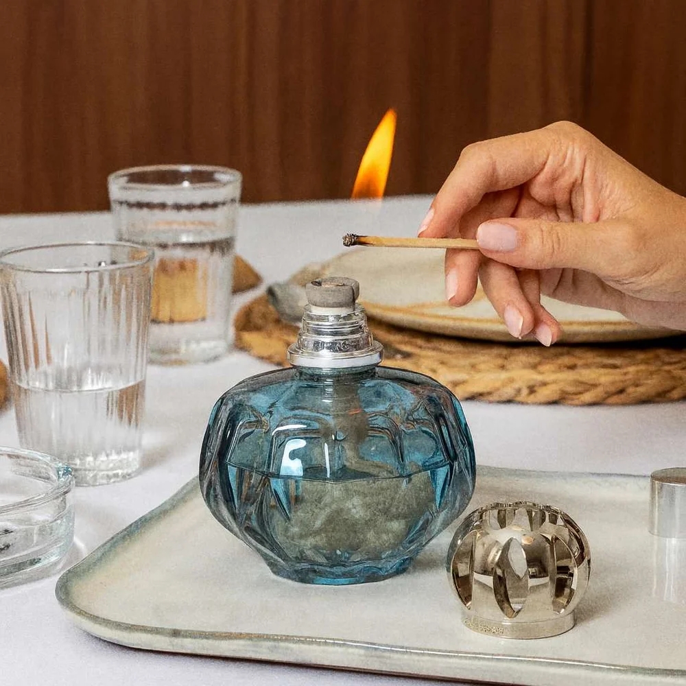 Katalytická lampa Rosalie zaujme oblými tvary. Honosný design, silnostěnné tónované sklo v odstínech modré nebo šedé. Stříbrná korunka působí elegantně a podtrhuje nadčasový charakter katalytické lampy Rosalie.